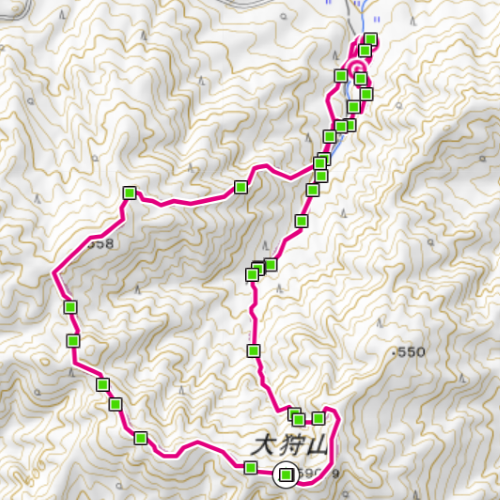防砂ダム公園駐車場→登山口→大狩山山頂→尼子道→展望地→登山口→駐車場 - 登山口からの標高差:282m(防砂ダム公園 →山頂)