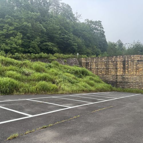 第二駐車場から登山口に向かいます。下の写真の上に左から回ったところが入口です。