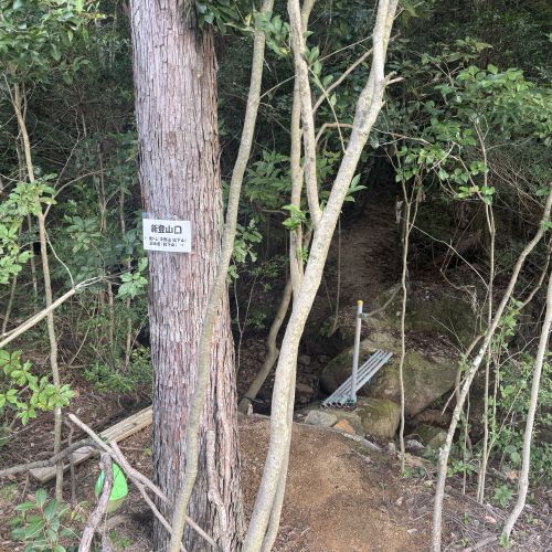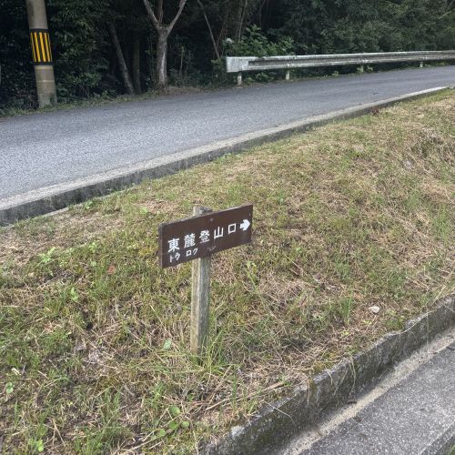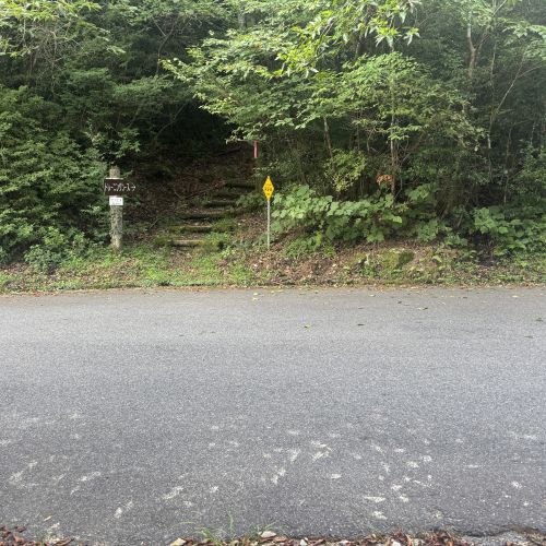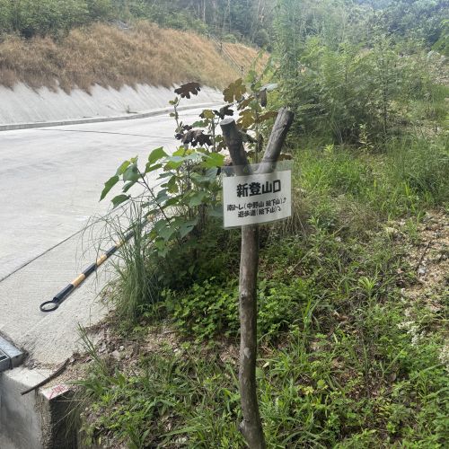 登山口の看板。以前はこの土の道を右に上がっていきましたが、現在まだ通れないようで、左から車道を上がっていきます。