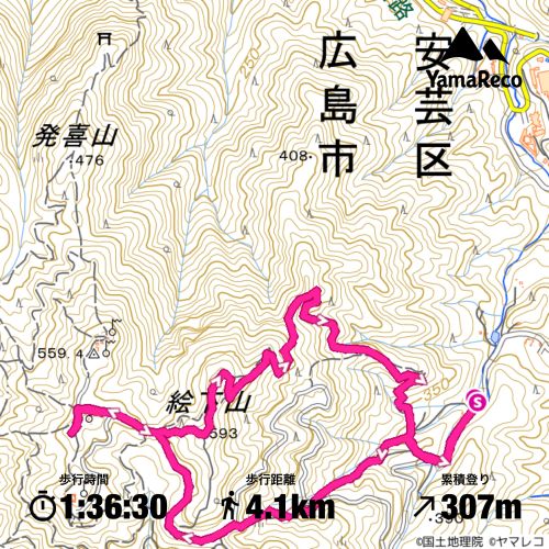 東麗駐車場→登山口→トレーニングコース南ルート→絵下山展望台→絵下山山頂→遊歩道→東麗駐車場
