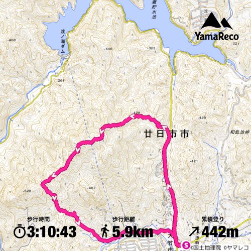 松ヶ原集会所→河平山東登山口→8号峰→7号峰→6号峰→山頂(5号峰)→4号峰→3号峰→2号峰→鞍部→河平連山西登山口→松ヶ原集会所 - 累計標高差:442m