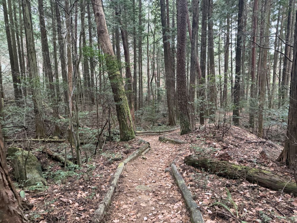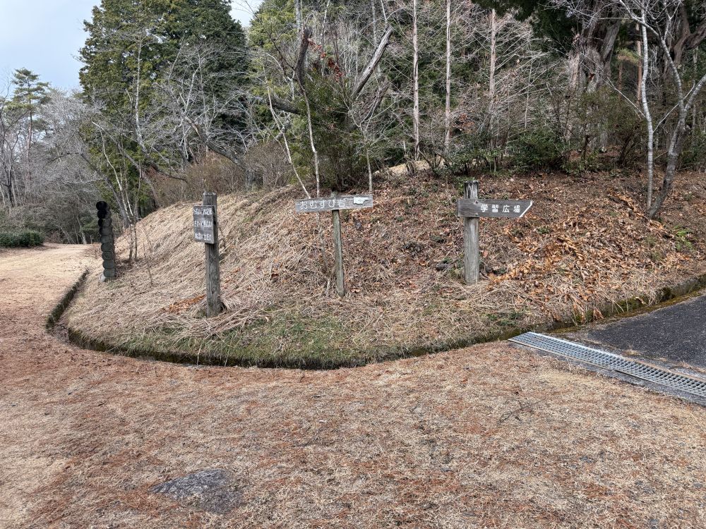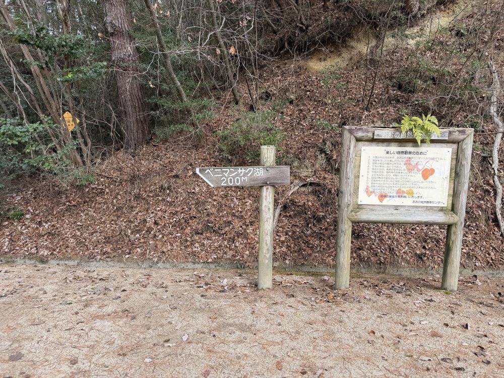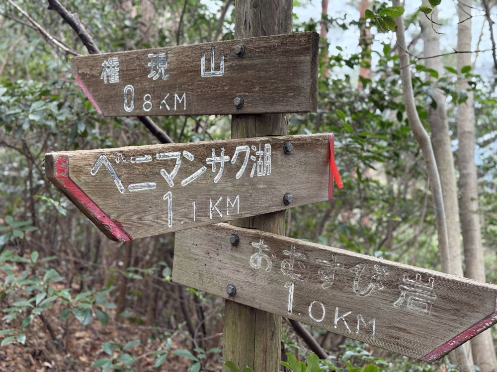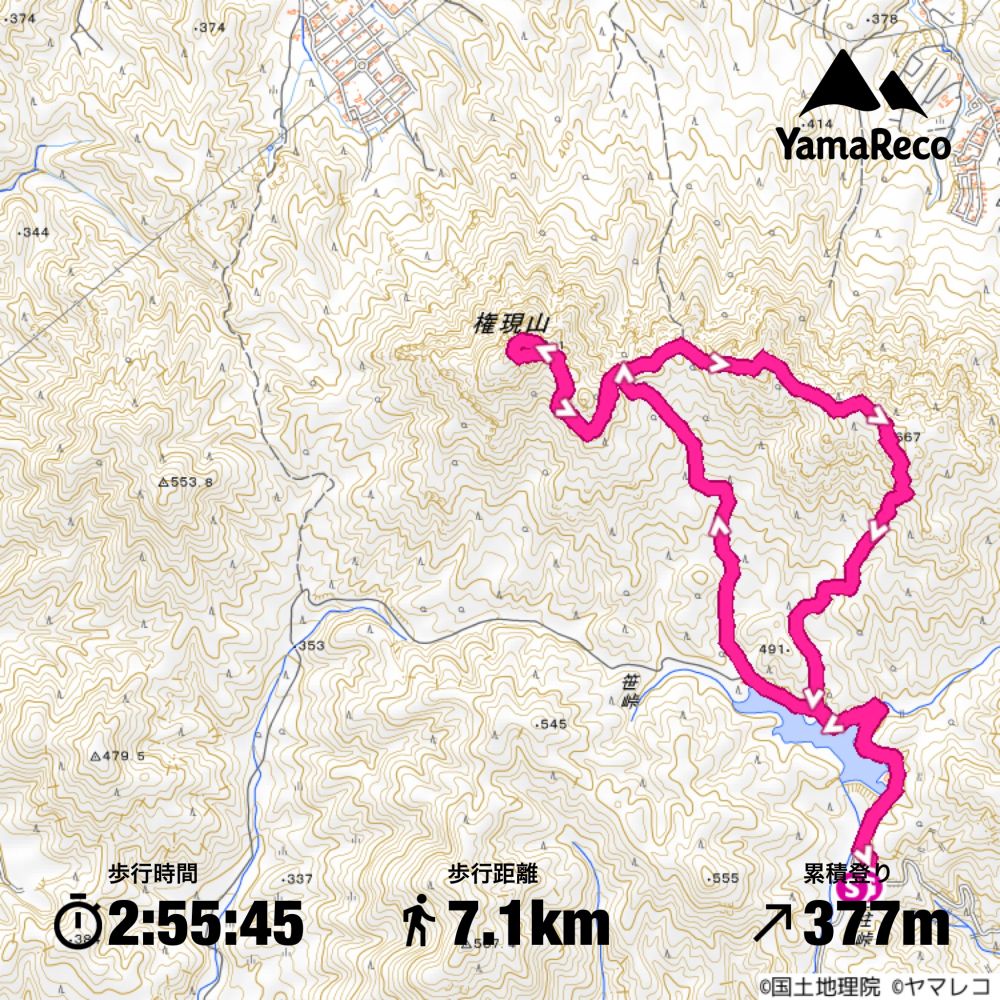 おおの自然観察の森入口→権現山登山口→ベニマンサク湖別れ→権現山山頂→ベニマンサク湖別れ→おむすび岩→おおの自然観察の森入口 - 累計標高差:377m