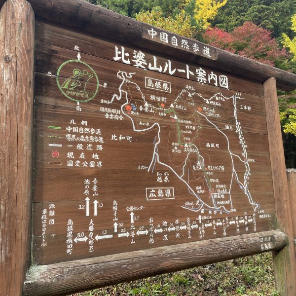 出発は、熊野神社から。中国自然歩道の立派な看板がスタートです。