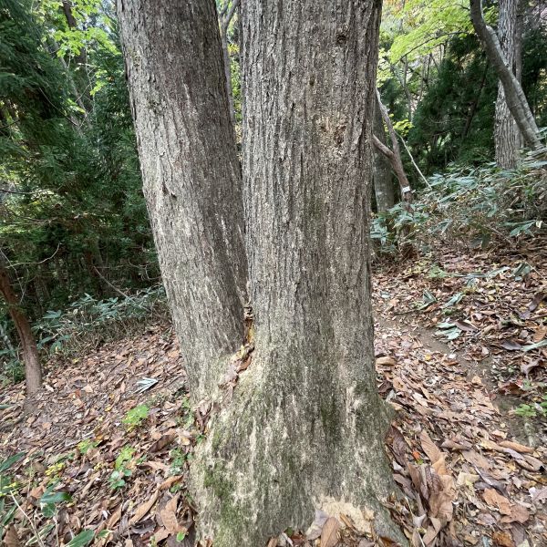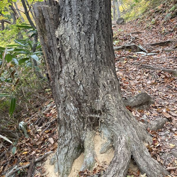 ナラ枯れの現場に遭遇。ナラの木の付け根にたくさんの粉状の木くずが溜まっています。カシノナガキクイムシという甲虫がナラ菌という菌を媒介して、ナラが枯れていくという現象。太いナラの木に多くみられる現象で、放置された里山で発生する象徴的な現象らしいです。